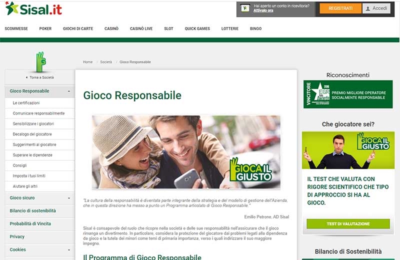 Sisal invita sempre e comunque di giocare responsabilmente. “La cultura della responsabilità è diventata una parte importante della strategia dell’azienda e un modello da seguire per tutti”, questo è ciò che dichiara l’amministratore delegato dell’azienda, in una politica, che pone Sisal in prima linea alla lotta contro la dipendenza al gioco compulsivo. Slogan per un pubblico, tra cui molti giovani, per far sì che il gioco rimanga sempre un divertimento e mai una patologia. Il programma del gioco responsabile si basa sugli standard internazionali promossi e divulgati dall’ European Lotteries e World Lottery Association. Per il Gioco responsabile sottolineiamo, in questa recensione Sisal, come con “Gioca il Giusto” sia stata rafforzata la posizione di questo operatore. Il programma, incentrato, sì, sull’intrattenimento, ma anche sulla prevenzione legata alle problematiche dei fenomeni del gioco come patologia.