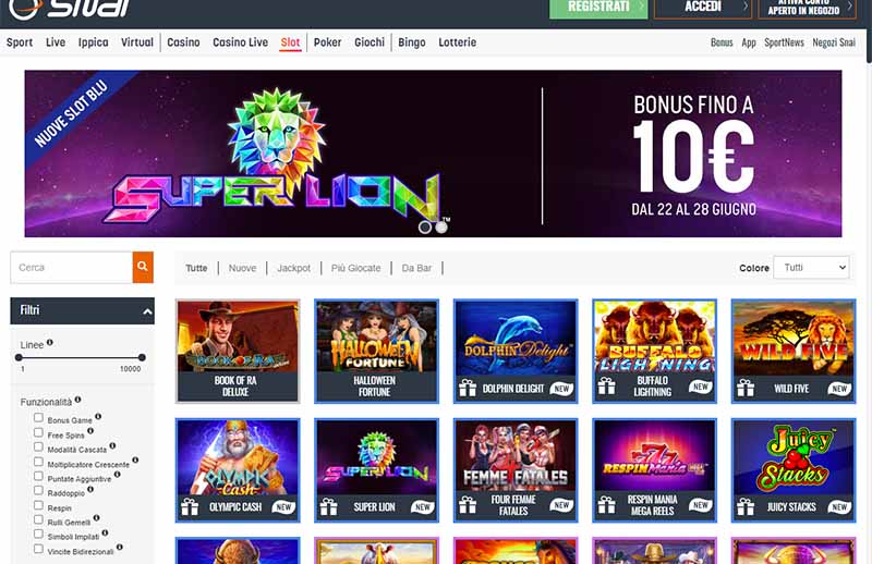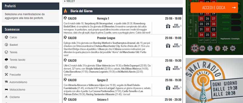 Se desideriamo il top del Gambling online, siamo nel posto giusto con Snai e questa recensione lo testimonia. Giochi da tavolo, videopoker, bingo, poker, slot machine, scommesse sportive e tanto altro sono, giochi che accontentano tutti gli appassionati. Partendo dalle scommesse sportive, l’esperienza di Snai fa la differenza. Questo bookmaker è il “boss” delle scommesse sportive come testimonia la sua offerta. La proposta non è solo grande calcio o tennis internazionale, ma anche eventi e sport cosiddetti minori. Quote su campionati minori o quasi sconosciuti in aree geografiche come la Bolivia, la Tunisia, la Cina, o di sport di minore interesse come Ping-Pong, hockey, polo, freccette, cricket e altro ancora. Per questo operatore, non da meno è la fascia delle scommesse live. Numerosi sono i bonus per i nuovi iscritti e non presenti su questo sito, tutti da scoprire.