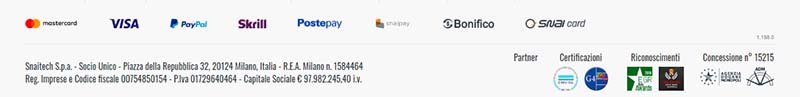 Oltre al già menzionato Paypal, Mastercard, Visa, bonifico bancario, Postepay, Skrill, Paymat, sono i metodi di pagamento usati da Snai per tutti i depositi e tutti i prelievi che si effettuano sulla piattaforma. Anche Snai, come la stragrande maggioranza degli operatori, accetta una ricarica minima di 10€. Ma per quanto riguarda il prelievo il cliente deve avere già effettuato l’invio della documentazione che ne certifichi l’identità, ma soprattutto la maggiore età. Questo per soddisfare le regole sulle normative vigenti. Per tutti circuiti menzionati tra i metodi di pagamento, tutti gratuiti, solo il prelievo effettuato con PostePay paga una commissione di 2 euro ad operazione.