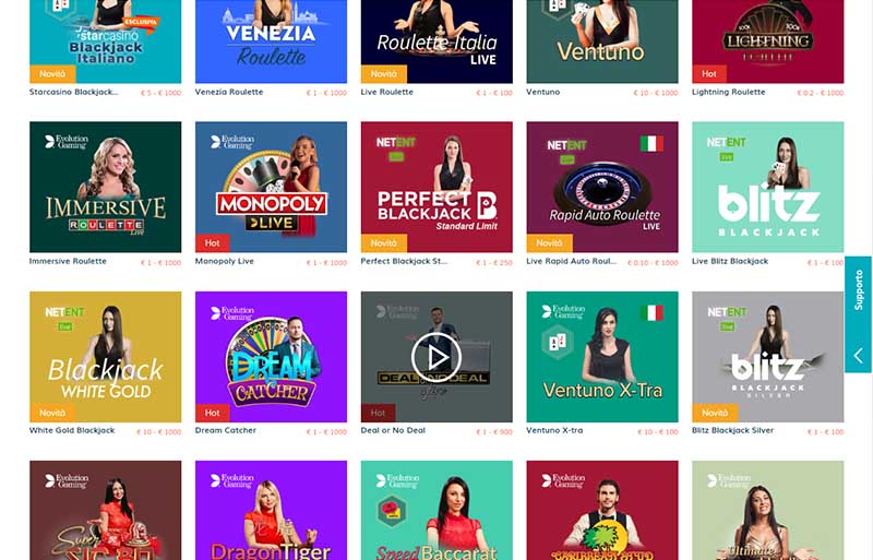 Giochi per tutti i gusti e per tutte le tasche nella sezione casinò e casino live, creati dal colosso del gaming Netent, sinonimo di qualità e garanzia. Anche altre aziende affiancano quest’operatore nella gestione delle Roulette, videopoker, slot machine e blackjack disponibili per nuove esperienze di gioco. Evolution Gaming, Magaways, Play’n Go, iSOFTbet, Microgaming, tra le altre garantiscono l’obiettivo di puntare sempre più in alto per restare sempre al top nella graduatoria dei bookmaker mondiali. In questa recensione su Starcasino, poniamo sotto la lente d’ingrandimento, appunto, come Netent abbia creato per StarCasinò tutta una serie di giochi ad alta fluidità di gioco e grafiche accattivanti. Il nostro consiglio è quelle di giocarle man mano un po’ tutte, ma restano tra le nostre preferite le classiche slot come Book of Ra o Starburst, che tra l’altro sono anche tra le principali slot legate ai bonus casinò.