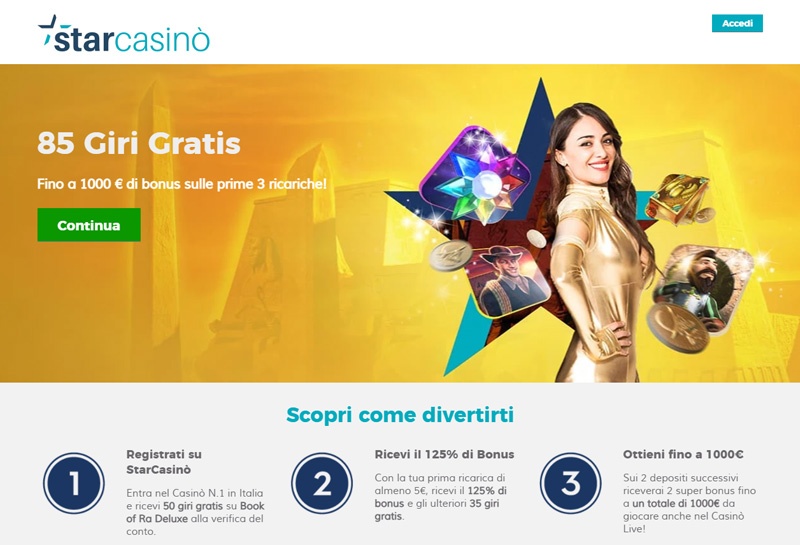 Non recente, ma sempre attuale l’offerta di cui parliamo nella nostra recensione di StarCasino, il famoso Super Bonus di Benvenuto con il 125% fino a 500€ sul primo deposito e 100 giri gratis! Scopriamo nei dettagli l’offerta. Come ogni offerta che si rispetti, il Bonus di Benvenuto è riservato ai soli nuovi iscritti. Il Bonus parte subito alla prima ricarica con un valore del 125% fino a 500€ e con ben 50 giri gratis da giocare con la famosa slot machine Starburst. Il bonus prosegue con le due ricariche successive, per un totale di 1000€ da impegnare sui tavoli live di Blackjack e Roulette. Un’offerta interminabile per tutti coloro che completino la registrazione con la carta d’identità entro 48 ore. Questi riceveranno ulteriori 50 giri da giocare e far girare su Starburst. Possiamo dire che quest’offerta mette tutti d’accordo, un solo bonus per slot e live casinò.